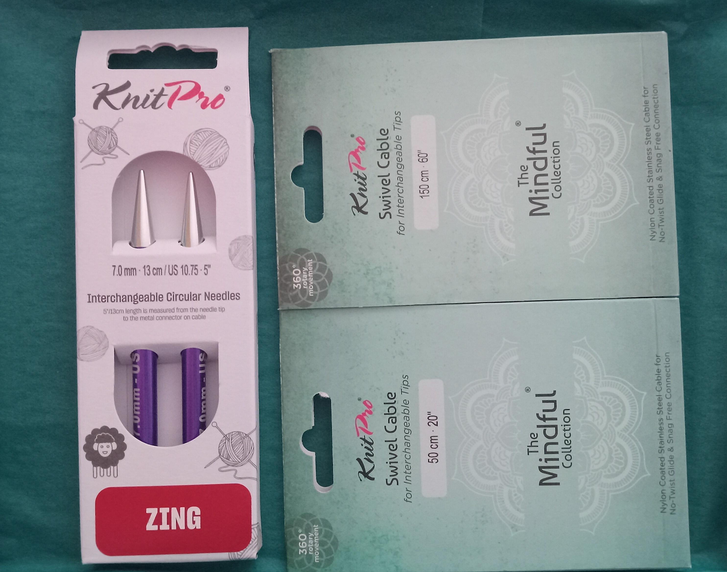 Love this length, perfect for cowls! I was a bit disappointed to have to buy the teal Mindful cords which didn't match my set of Knitter's Pride (now Knitter's Pro) interchangeable needle set, but the cable has absolutely no kink and a little texture to it that makes it a pleasure to knit with. The end caps are also very pretty and I also really like the improved tightening pin design. Items were packaged beautifully in a cardboard box with tissue paper and the cutest kitty stamps!